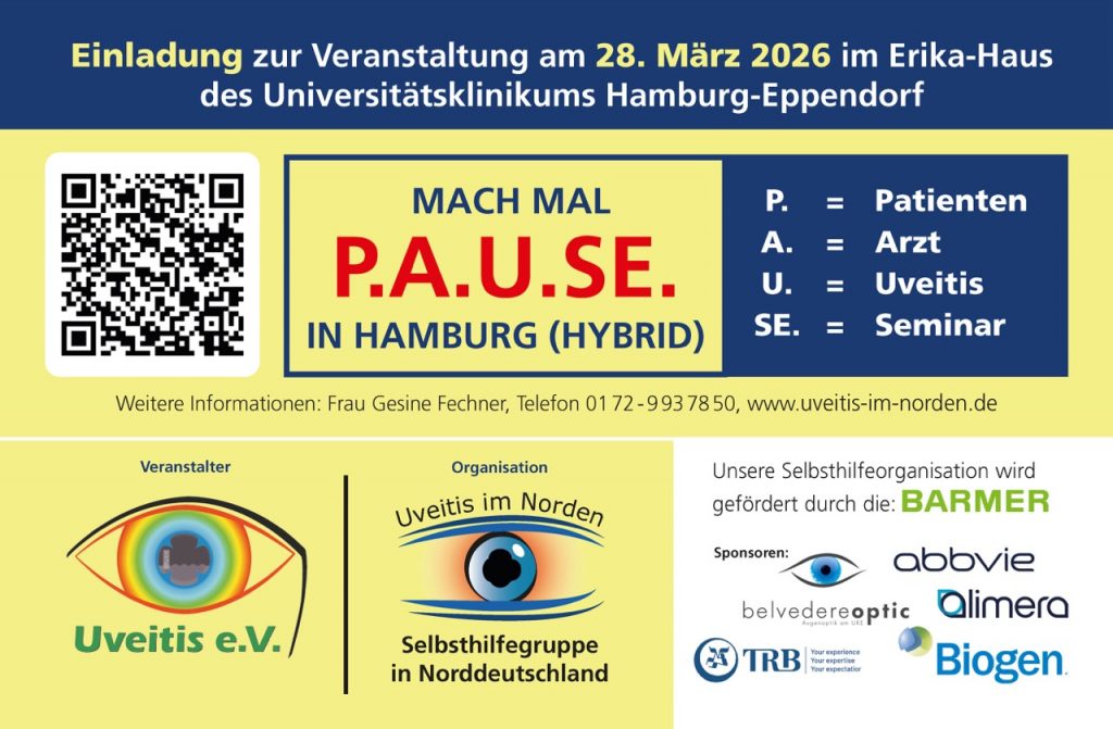 Unter dem Motto „Mach mal P.A.U.SE. in Hamburg“ lädt die Selbsthilfegruppe „Uveitis im Norden“ am Samstag, den 28. März, zu einer hybriden Fortbildung ein. Es ist der dritte Event dieser Art in Folge, die Veranstaltung findet wieder im Erika-Haus statt auf dem Areal des Universitätsklinikums Hamburg-Eppendorf, Martinistraße 52, von 9.45 bis 13.30 Uhr.